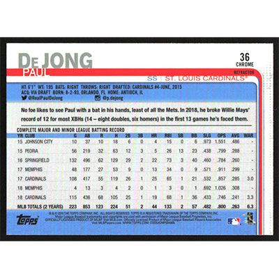 This is a 2019 Topps Chrome Refractors Paul DeJong baseball card. The card is #36 and pictures show condition.