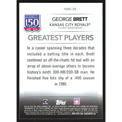 This is a 2019 Topps Chrome Update 150 Years of Professional Baseball George Brett baseball card. The card is #150C-25 and pictures show condition. Team(s): Kansas City Royals