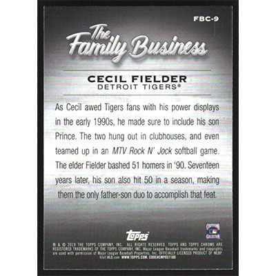 This is a 2019 Topps Chrome Update Edition The Family Business Cecil Fielder baseball card. The card is #FBC-9 and pictures show condition. Team(s): Detroit Tigers