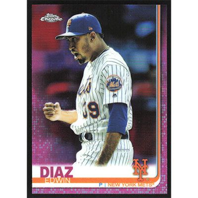 This is a 2019 Topps Chrome Update Pink Refractors Edwin Diaz baseball card. The card is #16 and pictures show condition.