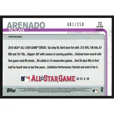 This is a 2019 Topps Chrome Update Refractors Nolan Arenado baseball card. The card is #73 and pictures show condition. This card is limited; #'d 061/250.