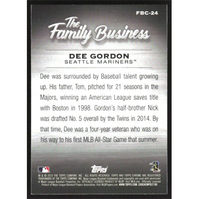 This is a 2019 Topps Chrome Update The Family Business Dee Gordon baseball card. The card is #FBC-24 and pictures show condition.
