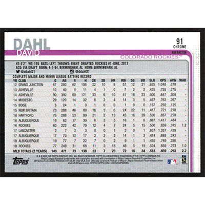 This is a 2019 Topps Chrome X-Fractors David Dahl baseball card. The card is #91 and pictures show condition.