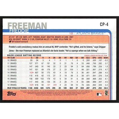 This is a 2019 Topps Clear Travel Freddie Freeman baseball card. The card is #CP-4 and pictures show condition.