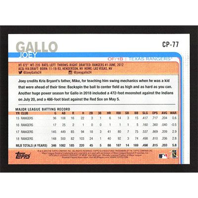 This is a 2019 Topps Clear Travel Joey Gallo baseball card. The card is #CP-77 and pictures show condition.