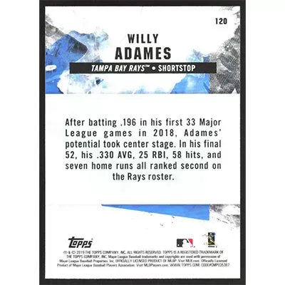 This is a 2019 Topps Fire Willy Adames baseball card. The card is #120 and pictures show condition.