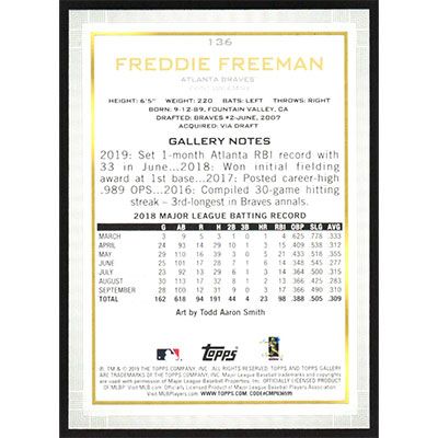 This is a 2019 Topps Gallery Freddie Freeman baseball card. The card is #136 and pictures show condition.