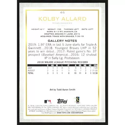 This is a 2019 Topps Gallery Kolby Allard baseball card. The card is #46 and pictures show condition.