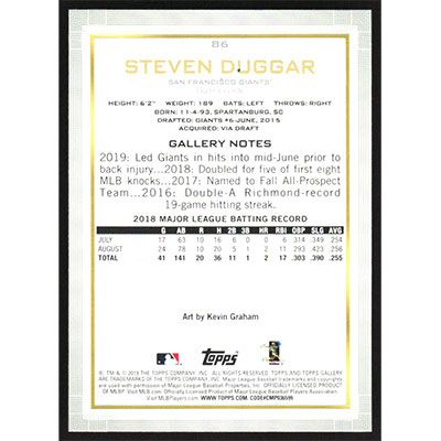 This is a 2019 Topps Gallery Steven Duggar baseball card. The card is #86 and pictures show condition. Team(s): San Francisco Giants Rookie Card (RC)