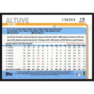 This is a 2019 Topps Gold Jose Altuve baseball card. The card is #178 and pictures show condition. This card is limited; #'d 1738/2019. Team(s): Houston Astros