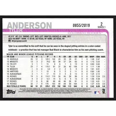 This is a 2019 Topps Gold Tyler Anderson baseball card. The card is #2 and pictures show condition. This card is limited; #'d 0855/2019. Team(s): Colorado Rockies