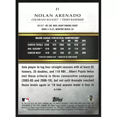 This is a 2019 Topps Gold Label Class 1 Nolan Arenado baseball card. The card is #21 and pictures show condition.
