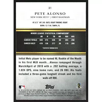 This is a 2019 Topps Gold Label Class 1 Pete Alonso baseball card. The card is #31 and pictures show condition. Team(s): New York Mets Rookie Card (RC)