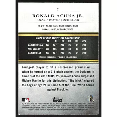 This is a 2019 Topps Gold Label Class 1 Ronald Acuña Jr. baseball card. The card is #7 and pictures show condition.