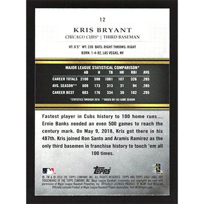 This is a 2019 Topps Gold Label Class 1 Black Kris Bryant baseball card. The card is #12 and pictures show condition.