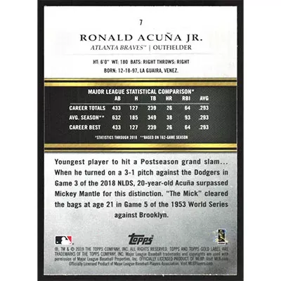 This is a 2019 Topps Gold Label Class 1 Black Ronald Acuña Jr. baseball card. The card is #7 and pictures show condition.