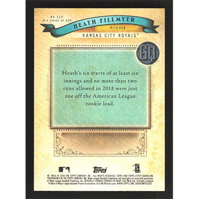 This is a 2019 Topps Gypsy Queen Heath Fillmyer baseball card. The card is #220 and pictures show condition. Team(s): Kansas City Royals Rookie Card (RC)