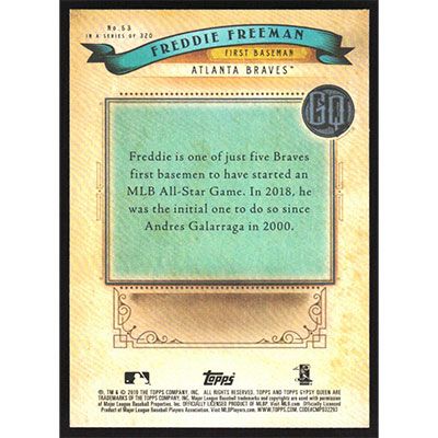 This is a 2019 Topps Gypsy Queen Freddie Freeman baseball card. The card is #53 and pictures show condition.