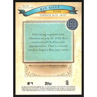 This is a 2019 Topps Gypsy Queen Green Ken Giles baseball card. The card is #281 and pictures show condition.