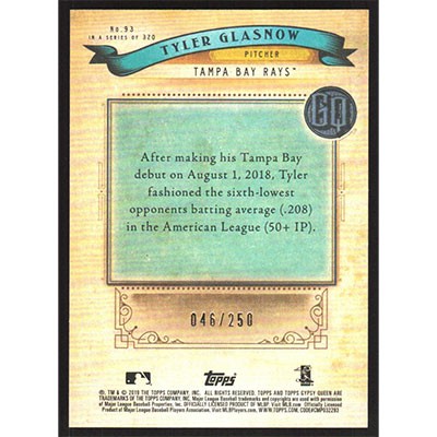 This is a 2019 Topps Gypsy Queen Indigo Tyler Glasnow baseball card. The card is #93 and pictures show condition. This card is limited; #'d 046/250. Team(s): Tampa Bay Rays