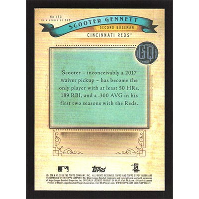 This is a 2019 Topps Gypsy Queen Players Weekend Variations GQ Logo Swap Scooter Gennett baseball card. The card is #173 and pictures show condition. Team(s): Cincinnati Reds