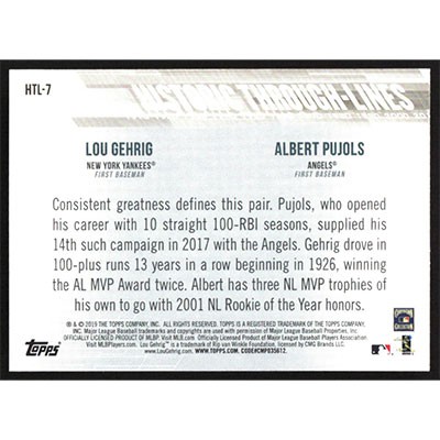 This is a 2019 Topps Historic Through-Lines Lou Gehrig/Albert Pujols baseball card. The card is #HTL-7 and pictures show condition. Team(s): New York Yankees/Los Angeles Angels