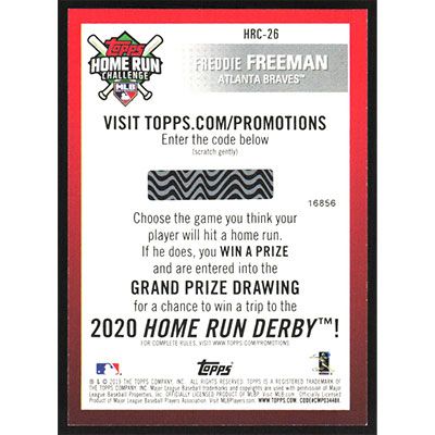This is a 2019 Topps Home Run Challenge Codes Freddie Freeman baseball card. The card is #HRC-26 and pictures show condition.