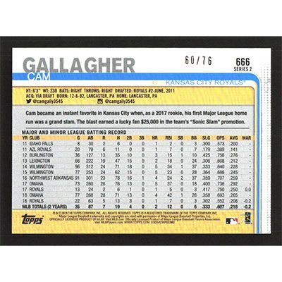 This is a 2019 Topps Independence Day Cam Gallagher baseball card. The card is #666 and pictures show condition. This card is limited; #'d 60/76. Team(s): Kansas City Royals