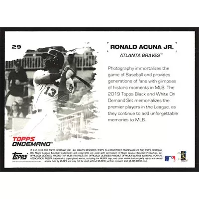 This is a 2019 Topps On-Demand Black and White Ronald Acuña Jr. baseball card. The card is #29 and pictures show condition.