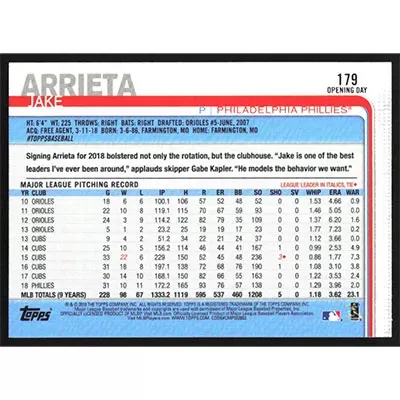 This is a 2019 Topps Opening Day Blue Foil Jake Arrieta baseball card. The card is #179 and pictures show condition. This card is limited; #'d /2019. Team(s): Philadelphia Phillies