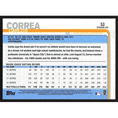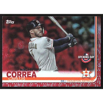 This is a 2019 Topps Opening Day Red Foil Carlos Correa baseball card. The card is #53 and pictures show condition.