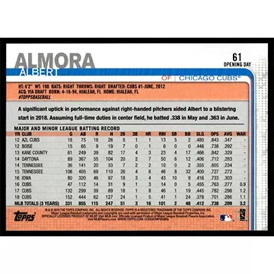 This is a 2019 Topps Opening Day Red Foil Albert Almora baseball card. The card is #61 and pictures show condition.