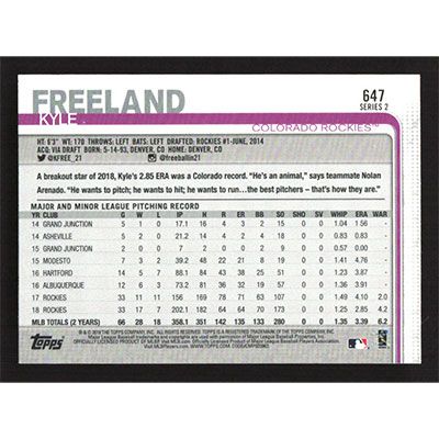 This is a 2019 Topps Rainbow Foil Kyle Freeland baseball card. The card is #647 and pictures show condition.