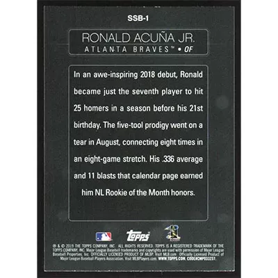 This is a 2019 Topps Stars of the Game Ronald Acuña Jr. baseball card. The card is #SSB-1 and pictures show condition.
