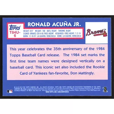 This is a 2019 Topps Update '84 Silver Pack Chrome Ronald Acuña Jr. baseball card. The card is #T84U-6 and pictures show condition. Team(s): Atlanta Braves