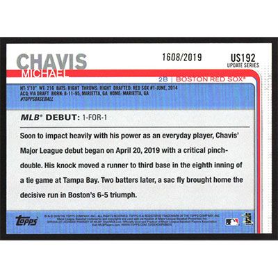 This is a 2019 Topps Update Gold Michael Chavis Rookie Debut baseball card. The card is #US192 and pictures show condition. This card is limited; #'d 1608/2019.