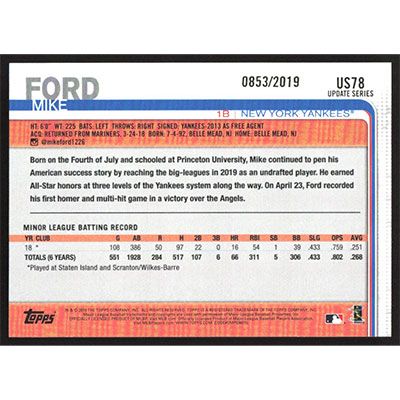 This is a 2019 Topps Update Gold Mike Ford baseball card. The card is #US78 and pictures show condition. This card is limited; #'d 0853/2019. Team(s): New York Yankees Rookie Card (RC)