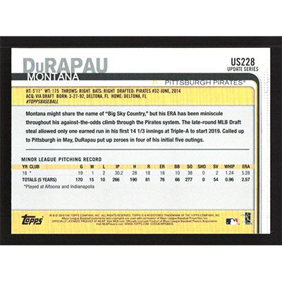 This is a 2019 Topps Update Rainbow Foil Montana DuRapau baseball card. The card is #US228 and pictures show condition. Team(s): Pittsburgh Pirates Rookie Card (RC)