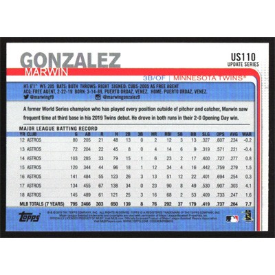 This is a 2019 Topps Update Marwin Gonzalez baseball card. The card is #US110 and pictures show condition.