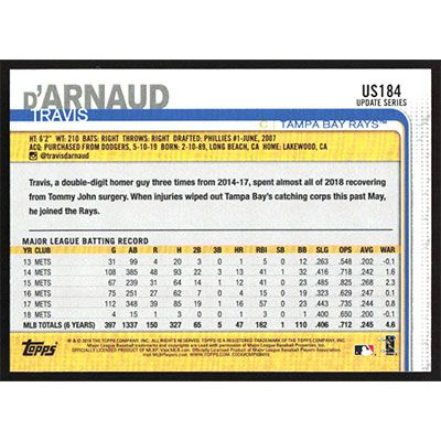 This is a 2019 Topps Update Travis d'Arnaud baseball card. The card is #US184 and pictures show condition.
