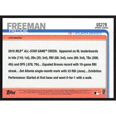This is a 2019 Topps Update Freddie Freeman All-Star baseball card. The card is #US279 and pictures show condition.
