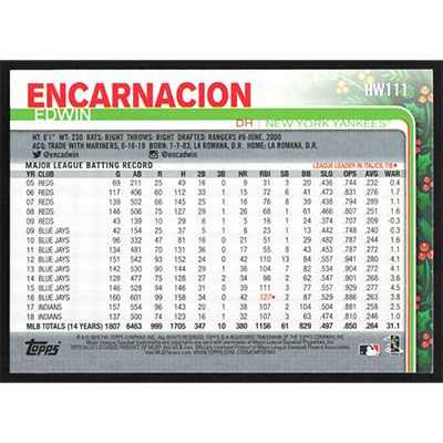 This is a 2019 Topps Wal-Mart Holiday Edwin Encarnacion baseball card. The card is #HW111 and pictures show condition.