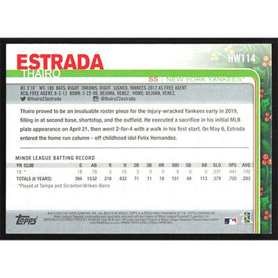 This is a 2019 Topps Wal-Mart Holiday Thairo Estrada baseball card. The card is #HW114 and pictures show condition. Team(s): New York Yankees Rookie Card (RC)