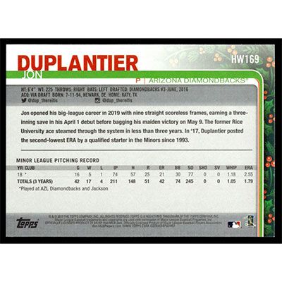 This is a 2019 Topps Wal-Mart Holiday Jon Duplantier baseball card. The card is #HW169 and pictures show condition. Team(s): Arizona Diamondbacks Rookie Card (RC)