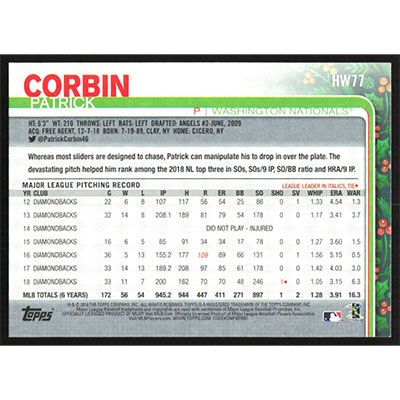 This is a 2019 Topps Wal-Mart Holiday Patrick Corbin baseball card. The card is #HW77 and pictures show condition.
