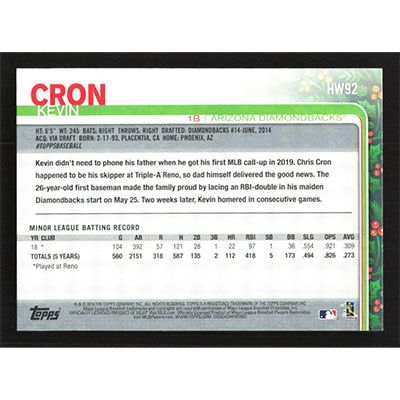 This is a 2019 Topps Wal-Mart Holiday Kevin Cron baseball card. The card is #HW92 and pictures show condition. Team(s): Arizona Diamondbacks Rookie Card (RC)