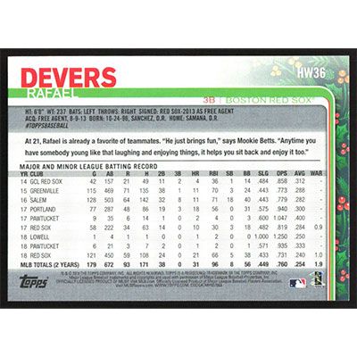 This is a 2019 Topps Wal-Mart Holiday Photo Variations Rafael Devers Tree in Background baseball card. The card is #HW36 and pictures show condition. Team(s): Boston Red Sox