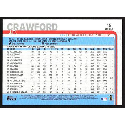 This is a 2019 Topps Walgreens Yellow J.P. Crawford baseball card. The card is #15 and pictures show condition.