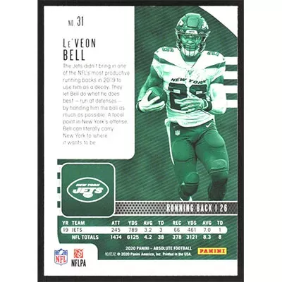 This is a 2020 Absolute Le'Veon Bell football card. The card is #31 and pictures show condition.