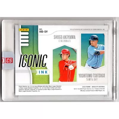 This is a 2020 Absolute Iconic Ink Duals Shogo Akiyama and Yoshitomo Tsutsugo autographed baseball card. This card has been signed, in blue, by Shogo Akiyama and Yoshitomo Tsutsugo, and is certified authentic by Panini. The card is #IID-YS and pictures show condition. This card is limited; #'d 09/25.